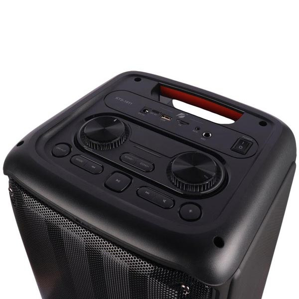 KTS1911 با طراحی چمدانی و ابعاد 27.9×28×59.6 سانتیمتر به راحتی قابل حمل است. این اسپیکر دارای دستهای ارگونومیک است که جابهجایی آن را سادهتر میکند. بدنه از ترکیب پلاستیک و فلز ساخته شده که علاوه بر وزن مناسب، دوام و استحکام بالایی دارد. نورپردازی داخلی و نمایشگر LED نیز به طراحی مدرن آن جلوهای خاص بخشیدهاند.